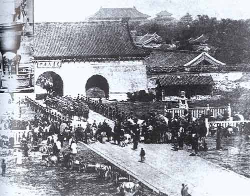 the Forbidden City represented the supremacy and sanctity of imperial power in China. To conquer the Chinese people and humiliate the Qing Government, the Allied Forces held a parade in the palace. The picture shows the Allied Forces passing the gate of Daqingmen.