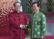 | Chinese Prsident Jiang Zemin and Singapore Prime Minister Goh Chok Tong in Chinese-Style Costumes.(10/21/2001) |