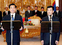 After their talks, Hu and Bagabandy attended the signing ceremony for cooperation documents, including an agreement on economic and technological cooperation between the two countries. They told reporters later that both are satisfied with the results produced at their talks and that strengthening China-Mongolia friendship and cooperation is in keeping with the fundamental interests of both sides.