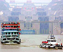 Two passenger ships passed through the huge, towering Three Gorges Dam ship lock on the Yangtze River Monday morning, signifying the accomplishment of a major goal of the world's largest water control project.