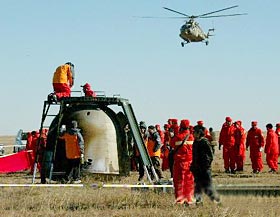 On the morning of October 16 (Beijing time), the Chinese-made Shenzhou V spacecraft successfully accomplished its mission including several scientific experiments after orbiting the earth 14 times, landing safely on the Amugulang grassland in Inner Mongolia at 6:23 am.