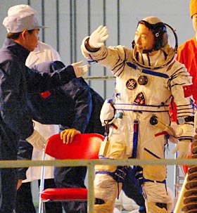 Two hours and 45 minutes before the launch, Yang Liwei began putting on a special astronaut suit for working and living in space and doing technical preparation.