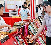 "Our moon cakes are priced, in general, from 5 to 10 Yuan apiece. But the best sellers are various 'Gift Packages'. The cheapest one is 260 Yuan, around 30 US dollars. Besides four moon cakes, you also get a set of tea wear, some jasmine tea and a delicate lighter. We also have special offers such as cigarettes, wine, jewellry, and even movie tickets and toys."