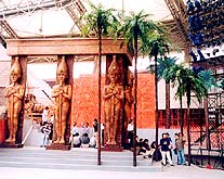 Produced by Beijing Bei'ao Grand Culture & Sports Events Co Ltd, with an investment of 30 million yuan (US$3.6 million), the stage was designed by Jiang Haoyang following his master stage-piece for the Three Tenors Concert at the Forbidden City in 2001, and creates an ancient Egyptian setting that specifically suits the Beijing Workers' Stadium.