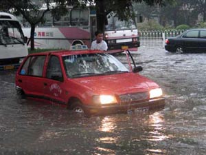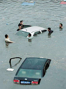 Many cars were nearly submerged and trapped in the water causing serious traffic jams at crossroads, said witnesses.
