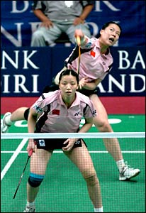 Lee Hyo Jung/Hwang Yu Mi put South Korea back in the tie when they surprisingly made a straight 15-7, 15-10 win over world's top duo Yang Wei/Zhang Jiewen. The victory is the first for the South Koreans in seven matches against the Chinese, and the only defeat of 20 overall matches played by the Chinese girls in the tournament.