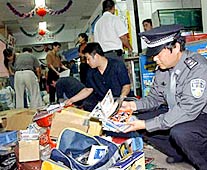 The Beijing authorities have suspended 40 stands in the capital's Hongqiao Market which sold faked foreign famous trademarks. Any shops or stands that sell Louis Vuitton, Givenchy, Fendi, Chanel, Burberry and another 20 foreign trademarks will be regarded as trademark violators and be seriously punished.