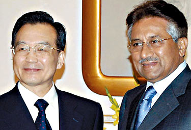 Premier Wen Jiabao (L) meets with Pakistani President Pervez Musharraf in Islamabad April 6, 2005.