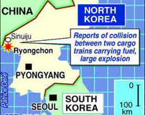The accident occurred when two trains carrying oil and liquefied petroleum gas collided and exploded in Ryongchon, a town about 20 km south of the border with China.