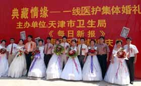 A group wedding ceremony is held in Tianjin, north China, July 8, 2003 for seven medical workers, whose weddings were delayed due to the fight against the SARS epidemic.