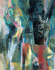 often employed through theatrical costumes and adornments in gaudy colors. He also uses dazzling gold color and dense ink to create a resplendent and magnificent visual effect. Modern western modeling method is also used on purpose to meddle the visual space and smash the images, making the works more powerful and lively.