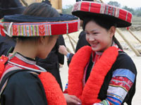 Two ethnic Yao girls smile as they help each other to adjust their new traditional dresses in a celebration in Badu village of Tianlin County, southwest China's Guangxi Zhuang Autonomous Region, December 29, 2001. The Yao people are now more colorfully dressed as they have become more well-to-do.