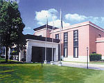 The red-bricked hall appears simple in contrast to other historical highrises.