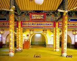 In front of the tower are a memorial archway and a screen wall covered with carved murals, which together form the main entrance of the mosque. Beyond it is the main hall where the congregation comes to pray. According to Islamic tradition, a Muslim in prayer must kneel down and prostrate himself in the direction of Mecca (in Beijing, to the west), which explains why the fagade of the main hall has an eastern aspect.