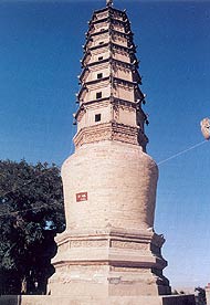 The pagoda's square base supports a huge Sumeru pedestal. On top of the pedestal is the hemispherical inverted-bowl-shaped part, then the multistoreyed part. The pagoda, some seventeen metres high, has a unique shape and exquisite contour and is an excellent example of ancient pagodas.