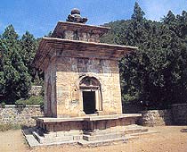 The 5.3-metre-high pagoda is a one-storey, pavilion-style stone structure with multitiered eaves. The square- body sits on a Sumeru pedestal. The front side has a door; the other sides have half-closed false doors. The chamber is also square, each side measuring 2.2 meters. The ceiling looks like a bucket upside down. The eaves are built of tiers of overlapping slabstones that widen as they go up, whereas the roof?s tiers of overlapping slabstones narrow as they go up. The steeple's base, formed by layers of slabstones, supports a stone lotus flower and a bead. The steeple is typical of one-storey stone pagodas of the Tang Dynasty.