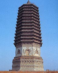 The first storey of the pagoda is majestic, typical of the multi-eaved style of the Liao and Kin dynasties. A false arch decorates the four sides facing the four directions; the other four sides have false windows. Carved on the headpiece of the arches are cloud and dragon patterns. Sculptures of vajra guardians, made of clay over wooden frames, flank the arches. The windows are decorated with little statues of seated Buddha and cloud patterns. Relief sculptures of bodhisattvas flank the windows. Eight brick columns decorated with dragon patterns stand at the corners of the pagoda. The name of the pagoda -- Yong'anwanshoo Pagoda -- is inscribed on the stone headpiece of the southern arch. Thirteen levels of eaves rise above the first storey. The steeple is supported by a pedestal with ornamental lotus petals and surmounted by a precious bead, resembling Tianning Temple Pagoda.
