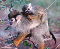 A four-month-old squirrel monkey continues to depend on his mother in a wildlife park in Hefei, Anhui Province on Nov. 7, 2004.