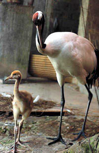 A month-old red-crowned crane stays close to its mother at the Fuzhou Zoo in