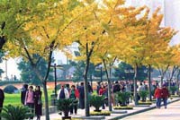 Pedestrians near People's Square in Shanghai wander under ginkgo trees whose leaves have turned a golden color.
