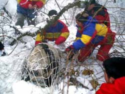 Rescue workers put a net around a giant panda found stranded in the snow at Xiling Snow Mountain, Dayi County, southwest China's Sichuan Province January 6, 2003.