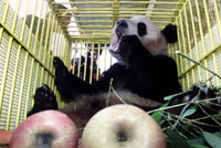 "We have prepared tasty local food for Xiong Bang, including apples, fresh bamboo leaves and tender, delicious bamboo shoots besides the powder milk and biscuits brought from Japan," said Wang Shuqun, the experienced keeper who will attend to Xiong Bang meticulously in the future.