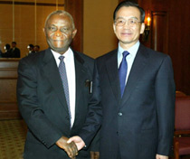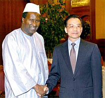 Chinese Premier Wen Jiabao (R) is greeted by Alpha Oumar Konare, chairman of the African Union (AU) Commission, in Addis Ababa, Ethiopia, Dec. 16, 2003.
