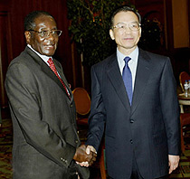 Chinese Premier Wen Jiabao (R) meets with Zimbabwean President Robert Mugabe in Addis Ababa, Ethiopia, Dec. 16, 2003.