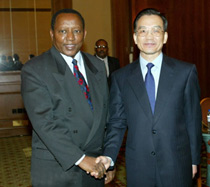 Chinese Premier Wen Jiabao (R) meets with Tanzanian Prime Minister Fredrick Sumaye in Addis Ababa, Ethiopia, Dec. 16, 2003.