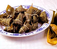 Dragon boat racing is an indispensable part of the festival, held all over the country. As the gun is fired, people will see racers in dragon-shaped canoes pulling the oars harmoniously and hurriedly, accompanied by rapid drums, speeding toward their destination. Folk tales say the game originates from the activities of seeking Qu Yuan's body, but experts, after painstaking and meticulous research, conclude that dragon boat racing is a semi-religious, semi-entertaining program from the Warring States Period (475-221 BC). In the following thousands of years, the game spread to Japan, Vietnam and Britain as well as China's Taiwan and Hong Kong. Now dragon boat racing has developed into an aquatic sports item which features both Chinese tradition and modern sporting spirit. In 1980, it was listed into the state sports competition programs and has since been held every year. The award is called "Qu Yuan Cup."