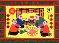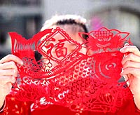 The Chinese character "fu" (meaning blessing or happiness) is a must. The character put on paper can be pasted normally or upside down, for in Chinese the "reversed fu" is homophonic with "fu comes", both being pronounced as "fudaole." What's more, two big red lanterns can be raised on both sides of the front door. Red paper-cuttings can be seen on window glass and brightly colored New Year paintings with auspicious meanings may be put on the wall.