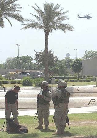 US soldiers stand guard outside a US court-martial in Baghdad, Iraq, May 19, 2004. The court-martial sentenced US soldier Jeremy Sivits to one year in jail over the abuse of Iraqi prisoners on May 19. (Xinhua Photo)