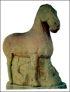 Recumbent horse The posture of this horse is one of rest, seemingly carefree and content after returning from battle. The horse lies on the ground, head alertly turned to the left and right foreleg bent a bit as it looks ahead without relaxing its will to fight. It appears to be awaiting a master's order. At 114 centimeters high and 260 centimeters long, it is a strong and sturdy horse. Assembled from several stones, this stone animal was shaped in full relief with simple, clear strokes. The fact that the horse is healthy and strong with full, clear musculature is a tribute to the majesty of the horses which performed brilliantly during the war of resistance against the Hun.