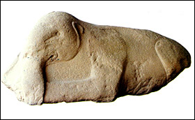 Monstrous beast eating a sheep With short body and long legs, square head and a pair of horns, and sharp fangs, this monstrous beast appears fierce and cruel. It has a sheep in its claws and is eating despite the sheep's resistance. Unfortunately, the sheep is helpless and doomed. This statue made use of an irregular stone 274 centimeters long and 220 centimeters wide. By means of a relief technique, beast and sheep are clearly defined, though their images are in the same stone.