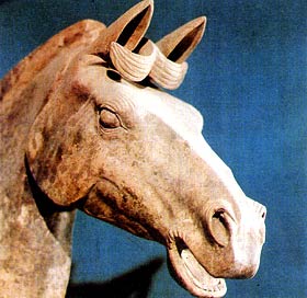 There were passageways to the underground tomb from the four directions of east, south, west and north. These passages were very large and peculiar in layout. For example, horses and chariots were excavated in one of the chambers in the western tomb passage. Some were painted wood with canopies, others were bronze, hitched to horses and decorated with colored drawings. Every chariot had a single shaft and double wheels and was harnessed to four horses. These bronze chariots and horses, excavated in November I980, were two groups of imperial chariots: Four of "security" and four high ones. High chariots, driven by drivers wearing swallow-tailed caps, battle robes and swords preceded the "security" chariots ridden by drivers sitting back to the rear. The castings are in proportions half the size of live men, horses and chariots. These vivid excavations are precious bronze arts.
