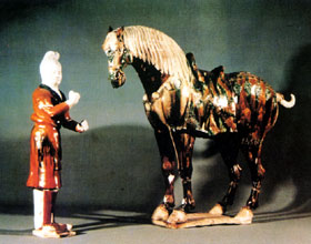 aches of painted pottery unearthed from the Zheng Rentai and Zhangshigui tombs are a new discovery of great value. The brightly colored human figures display a variety of postures; elaborate gestures, movements and facial expressions, and clothing and decorations, give these pieces a subtle, but lively look. Deserving of special attention are figurines of ethnic minority people, reflecting the close relationships between ethnic cultures in bordering areas and the culture of hinterland China. Camels carrying silk cloth also are symbols of China's friendly economic and cultural exchange with foreign countries during the Tang Dynasty.