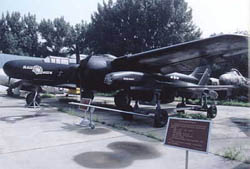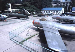 Also on display in the outdoor exhibition area are the jet pursuit planes manufactured and used in China, such as Model Jian-7 (MIG-21) and Jian-6 (MIG-19) supersonic pursuit planes, and Model MIG-17, MIG-15, and MIG-15 BIS high-subsonic jet pursuit planes. The earlier Model MIG-9 and Jian-7 jet pursuit planes can still do whole-plane transmission demonstration as well as the demonstration of lowering and raising the landing gear and the wing flaps of the reducing plates. Also on display is a Model 147H unmanned reconnaissance plane. The planes on display demonstrate the evolution process of the plane structures and models.