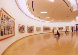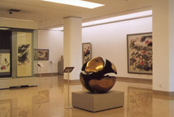 There are totally 13 exhibition halls in the museum, and the three collective anti-ultraviolet radiation colored fluorescent lamps are illuminating on the halls. The acreage of the round hall is 480 square meters that is suited for hanging the large-sized art works. The acreages of the east and west side halls in the first floor are 470 square meters respectively that are equipped with large glass exhibition cabinets. While each of the four corner halls cover an area of 500 square meters; The exhibition places of the second and third floors are opposed to the main hall; The new painting collecting storeroom occupies an area of 5,000 square meters.