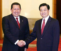 Hu spoke highly of the achievements made by both sides since they established diplomatic ties 30 years ago. He said during the 30 years, especially since President Chavez came into power, bilateral relations have been deepened and more high-level visits have been carried out. The two countries enhanced mutual understanding and political trust, expanded trade and economic cooperation and supported and closely cooperated with each other in international affairs.
