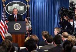 "Our troops will come home when Iraqis are capable of defending themselves," Bush told a news conference. But he declined to give a timetable for bringing American forces home.