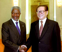 He was speaking in Beijing on Monday afternoon at a meeting with UN Secretary-General Kofi Annan who arrived here earlier in the day for a working visit.