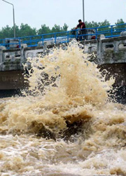 When the sluice gates at the Wangjiaba section of the Huaihe River opened at one a.m. Thursday, torrential floodwaters gushed toward the Mengwa flood division area where 12,000 hectares of fertile farmland were soon submerged.