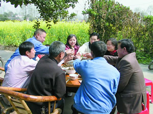 It was noon when we came to Fu?s one-story house beside a large river. Taking seats in front of the house, we were served a sumptuous lunch beneath an old orange tree. As our lunch table was set beside the rape fields and the river, we could smell rape flower perfume and feel the gentle breeze from the river.