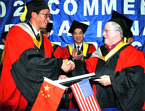 ここ數年、教育事業は大きな発展をとげている。10年前に、MBA(経営學修士コース)はまだ余り知られていなかったが、2003年には、MBAコースを開設した學校は62校に増え、學生數も3萬人に達している。EMBA(インターネットを活用した管理職向けの短期MBA教育)、MPA(行政経営學修士コース)などの國際職業資格教育も人々の目指す目標となっている。北京大學、清華大學などの47校のMPAコース在學生數は7700人に達している。