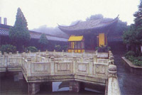 普陀山の第二のお寺は法雨寺である。四百年の歴史を持つこの法雨寺は、黃金色の瓦が太陽の光を受けて輝いている。この瑠璃瓦は、清の皇帝の命令によって、明の都南京の宮殿を取り壊し、それをわざわざ南京から運んできたものである。