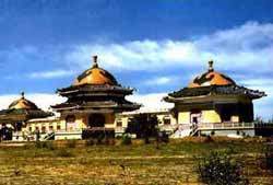 12世紀頃のモンゴル族の首領(lǐng)?ジンギスカン(1162-1227年)の陵墓である。伊金霍洛旗に位置する。包頭から南へ東勝を経由して120km。主體建築は3つのモンゴル族の住居、パオの形をした大殿からなっており、中央は記念堂になっている。記念堂の裏にジンギスカン夫婦の柩が安置されている。陵墓全體は壯大で、線香の煙がゆらぎ、國內(nèi)外からの參拝客は多い。毎年4回の正式祭祀活動があり、盛大でにぎやかである。