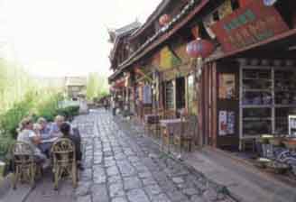 まずは麗江を訪れたほとんどすべての人が行く四方街に向かった。この通りは、東西に約150メートル、道幅は約25メートル。道に沿ってぎっしりと店舗が並ぶため「四方街」と呼ばれる。またナーシー族の言葉では「ジルグ」と呼ばれ、それは「街の中心」という意味だという。元代初期に露天の市場として始まり、清代にはすでに相當(dāng)の規(guī)模になっていたという。當(dāng)時(shí)、市場では土地の布や、穀物、野菜、酒、薪などが売られていた。今もここは街の商いの中心で、店では麗江特産の手作りの銅器、ナーシー族の民族衣裝、ナーシー族に伝わるトンバ文字を刻んだ工蕓品、高原で採れる希少な漢方薬材、土地の食品などが売られている。だから麗江を訪れた人は、ここを見學(xué)し、旅行の記念の品を買うことになる。 四方街は六本の通りとつながっていて、ここから麗江のどこにでも行くことができる。通りには石畳が敷かれており、ところによってそれが縦並びになっていたり、橫並びになっていたりする。聞くところでは、往時(shí)、不案內(nèi)な旅人でもインドへ向かう道と、チベットへ向かう道をすぐ見分けることができるように、敷き方が工夫されていたのだという。