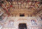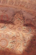 第7窟では、入口に3層の木造のひさしがあり、室內(nèi)は前後に分かれている。後室の正面壁の上部に獅子に座す菩薩が彫像され、東と西、南の壁上いっぱいに龕が彫られており、南壁門に刻された6體の供養(yǎng)菩薩は、優(yōu)美で迫真力に富む。天井の浮き彫り?飛天像はハスの花を中心に回転しながら飛び、踴り、生き生きとして感動(dòng)的だ。