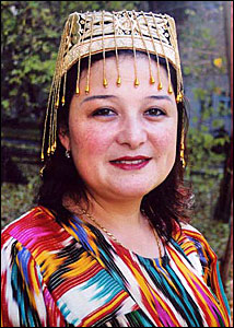 服飾 ウズベク族の人々はよく花模様入りの帽子をかぶり、女性は頭巾とマフラー姿。男子は襟口や袖口に十字の花模様が刺繍されたワイシャツを著、女性はワンピースを著るのが好き。