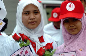 寫真(上):通行人にバラの花と輸血知識パンフレットを配る、インドネシア赤十字とインドネシア輸血協會のボランテイア=ジャカルタ中心部で14日撮影